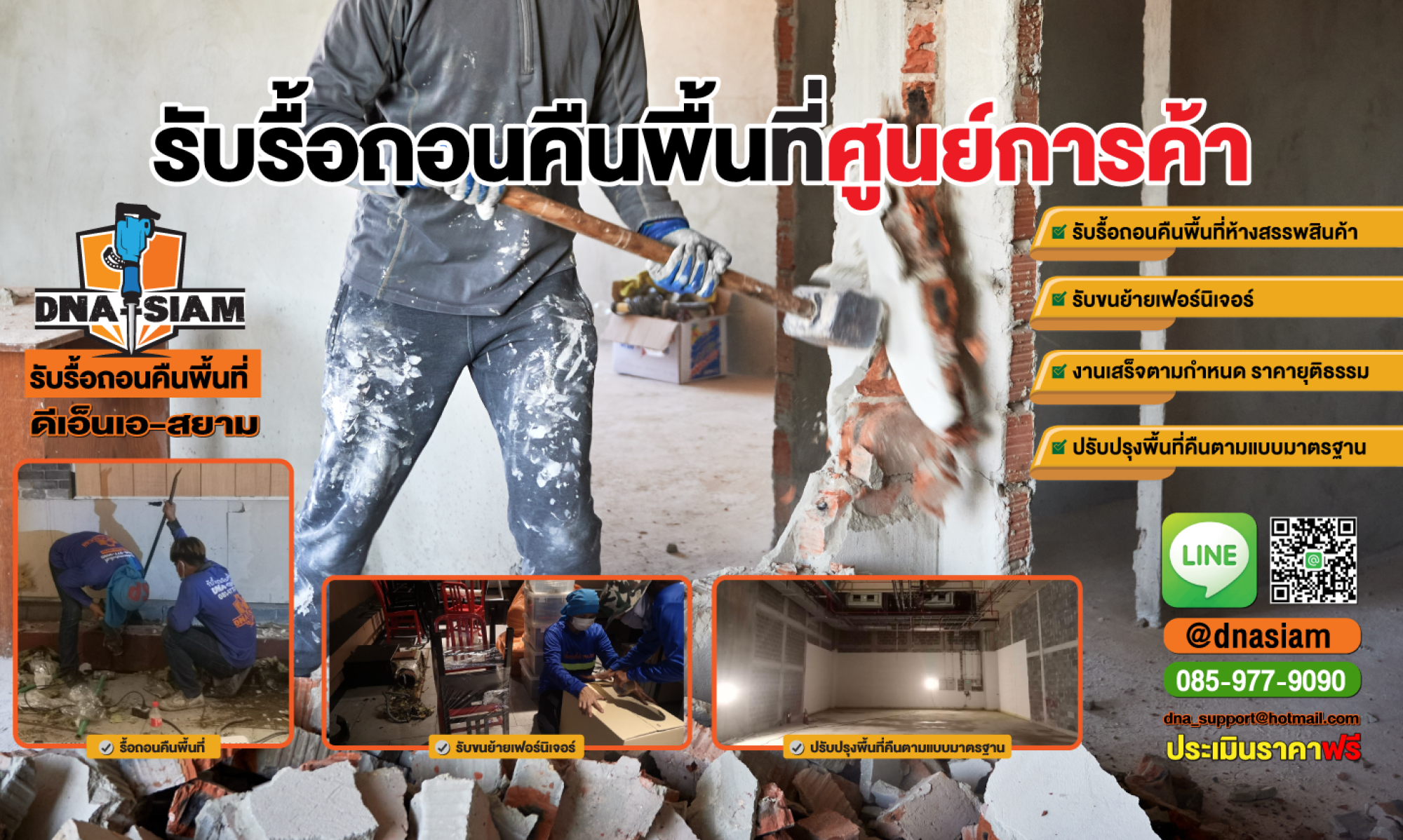 หากคุณกำลังมองหาผู้เชี่ยวชาญด้านงานรื้อถอนร้านค้าเพื่อคืนพื้นที่ให้ศูนย์การค้า DNA-SIAM พร้อมให้บริการรื้อถอนร้านค้าและร้านอาหารแบบครบวงจร ตั้งแต่งานรื้อถอน ขนย้าย ไปจนถึงการปรับปรุงพื้นที่ให้พร้อมส่งคืนฝ่ายอาคารอย่างถูกต้องตามมาตรฐาน เรามุ่งเน้นการทำงานที่ รวดเร็ว ประหยัด และปลอดภัย ด้วยทีมงานมืออาชีพที่มีประสบการณ์มากกว่า 10 ปี และได้รับความไว้วางใจจากศูนย์การค้าชั้นนำทั่วประเทศ DNA-SIAM พร้อมดูแลทุกขั้นตอนอย่างใส่ใจ เพื่อให้ลูกค้ามั่นใจและพึงพอใจสูงสุด ติดต่อเรา DNA-SIAM โทร. 085-977-9090